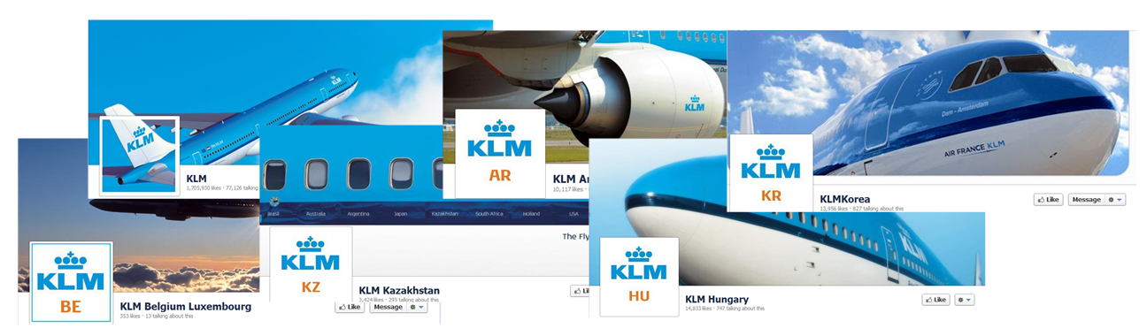 KLM’s Facebook pages: Argentina, Belgium, Brazil, Canada, Czech Republic, Denmark, Dutch Caribbean, Ecuador, Spain, Finland, Germany, Greece, Hong Kong, Hungary, India, Indonesia, Ireland, Italy, Japan, Kazakhstan, Kenya, Korea, Malaysia, Norway, Peru, Philippines, Poland, Portugal, Romania, Russia, Switzerland (in German), Switzerland (in French), Switzerland (in English), Singapore, South Africa, Suriname, Sweden, Thailand , Turkey, UK, Ukraine and USA.