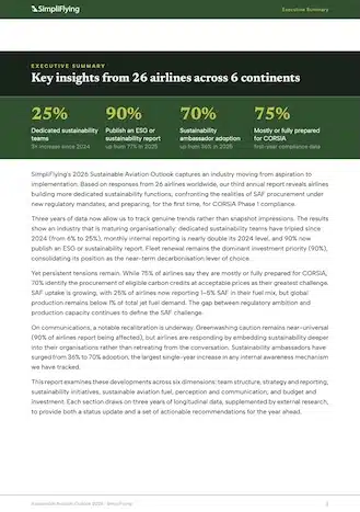 Our 2026 Sustainable Aviation Outlook captures an industry moving from aspiration to implementation. Based on responses from 26 airlines worldwide, our third annual report reveals airlines building more dedicated sustainability functions, confronting the realities of SAF procurement under new regulatory mandates, and preparing, for the first time, for CORSIA Phase 1 compliance.