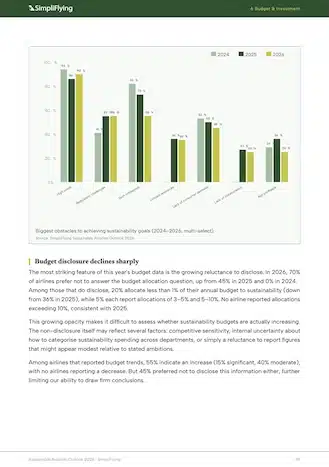 The share of airlines with both sustainability KPIs and incentive structures has doubled. Fleet renewal has consolidated its position as the dominant near-term investment, while technological and cost barriers show nuanced movement. Budget disclosure, by contrast, has declined sharply.
